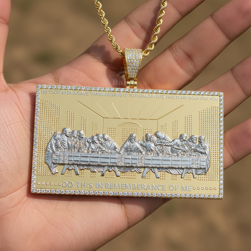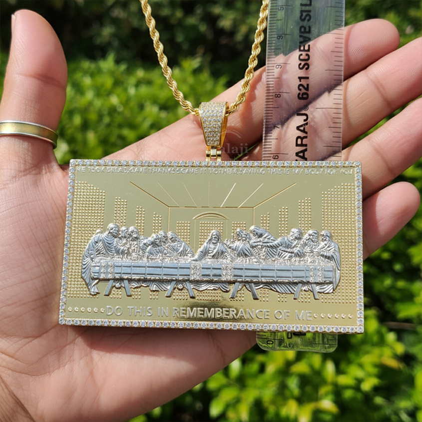 The Moissanite Iced Solid 925 Silver 3D Last Supper Pendant features a stunning display of sparkling brilliance that will leave you mesmerized. This Last Supper Pendant is adorned with a total of 140 moissanite stones, each one precisely cut and polished to perfection to maximize their dazzling brilliance. The unique 3D design of the Last Supper scene adds depth and dimension to the Last Supper Pendant, making it a true work of art that will enhance any outfit…..