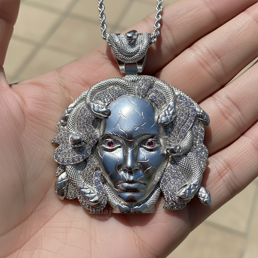 Crafted from solid 925 sterling silver, this Medusa Pendant is built to last. The high-quality materials used ensure that the pendant is not only durable but also hypoallergenic, making it safe for those with sensitive skin. The moissanite stones used in the Medusa Pendant are of the highest quality, with a brilliance and fire that rivals that of diamonds. This makes the Medusa Pendant not only a beautiful accessory but also a valuable investment piece.